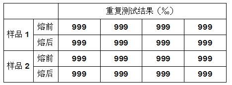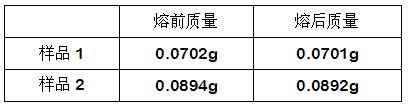 1. 通過試驗發現,該足金吊墜熔融前后的質量、金含量變化甚微,說明該樣品由足金制成,未附著在有機物材質(如塑料、特種紙質等)基底上。